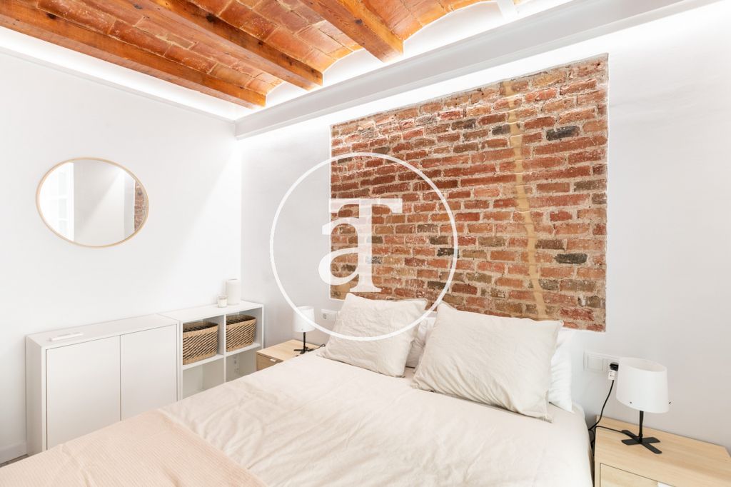 The day area consists of a bright living room, with wooden details and Catalan vault ceiling that give a very cozy feel to the space. The kitchen is semi-integrated and very modern, it has all the utensils and appliances to cook at home, such as ceramic hob, oven, microwave, refrigerator, dishwasher, coffee maker and toaster.