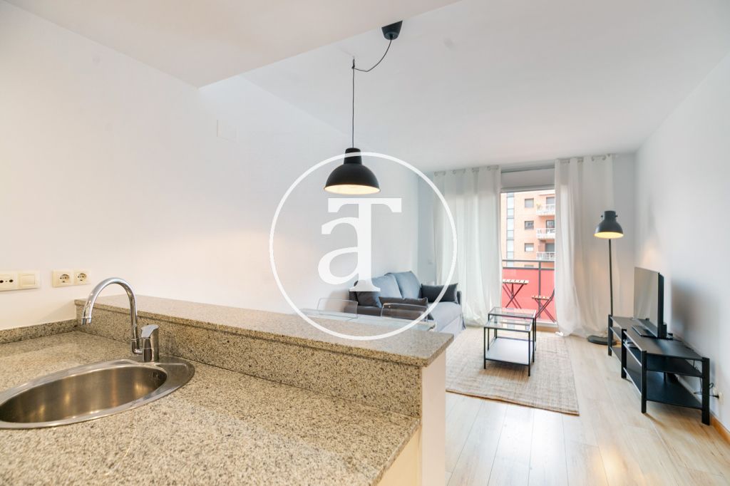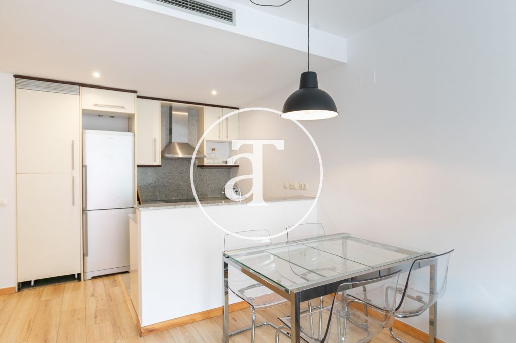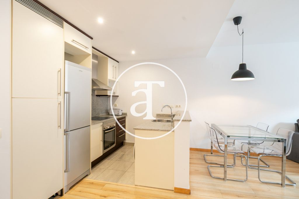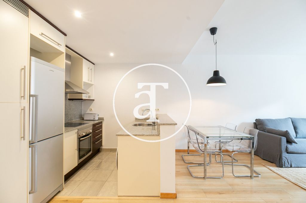 Cet appartement en location courte durée offre un agencement pratique et confortable, idéal pour les personnes s'installant à Barcelone pour leurs études ou un projet professionnel. L'espace de vie comprend un séjour/salle à manger spacieux et lumineux, meublé d'un canapé, d'une table et d'une télévision. Il s'ouvre sur une agréable terrasse d'environ 5 m² avec une table et des chaises, parfaite pour prendre le petit-déjeuner en plein air ou se détendre en fin de journée. La cuisine, intégrée au séjour, est dotée d'un bar qui accentue la sensation d'espace. Elle est entièrement équipée avec un four, un réfrigérateur, un grille-pain et tous les ustensiles nécessaires au quotidien, pour un confort de vie optimal.